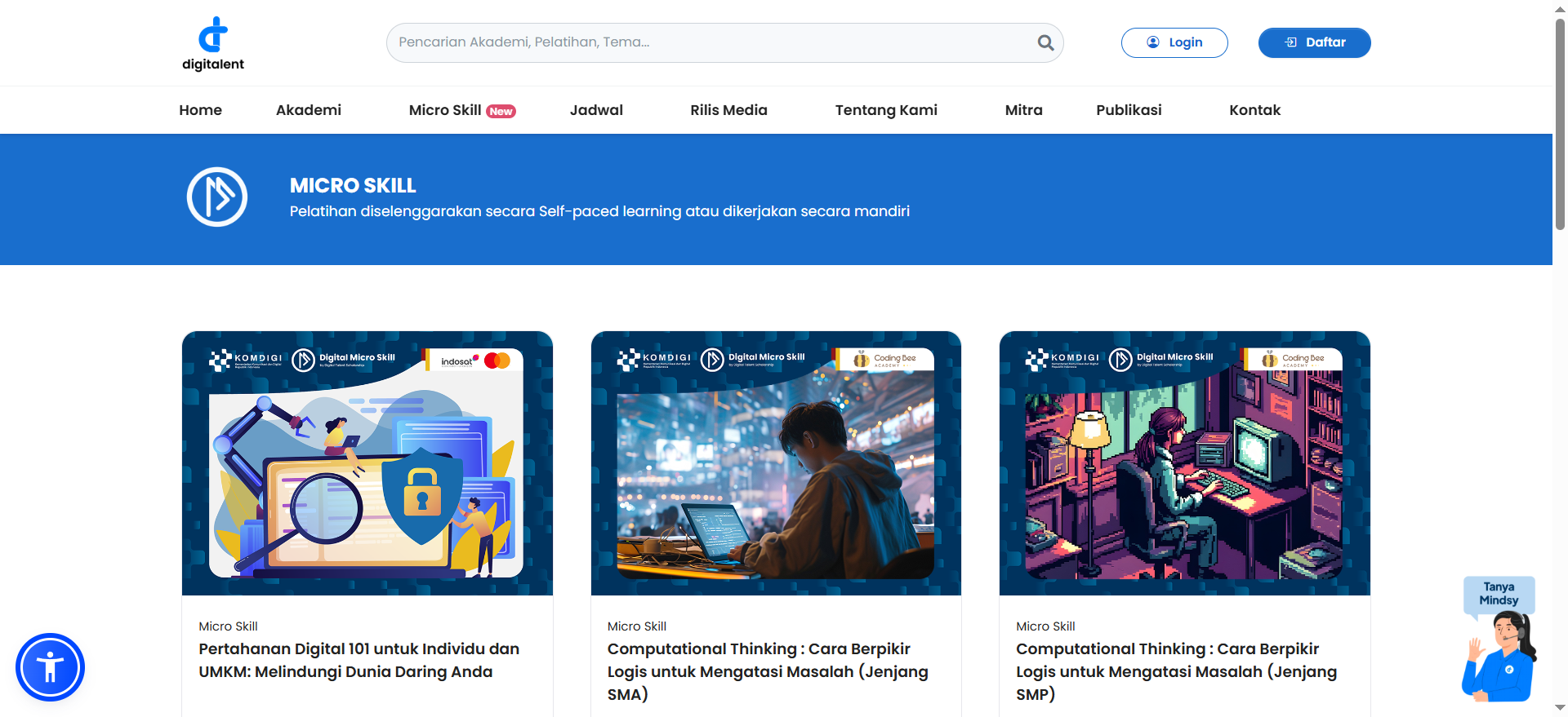 Micro Skill adalah bagian dari Digital Talent Scholarship (DTS) yang ditujukkan untuk memperkuat kemampuan digital masyarakat Indonesia. Program Micro Skill menerapkan sistem self‑paced learning, artinya peserta dapat belajar secara mandiri dan fleksibel melalui materi video on-demand yang dapat diakses kapan saja. Cocok bagi siapapun yang ingin meningkatkan kompetensi digital, memperoleh sertifikat resmi, serta memperluas jaringan profesional di era digital.