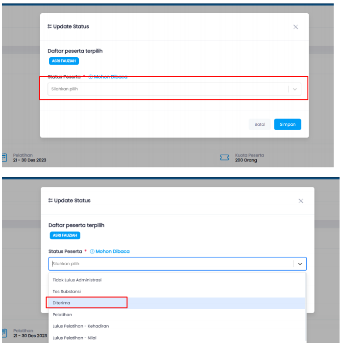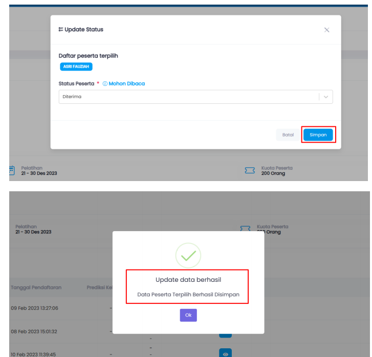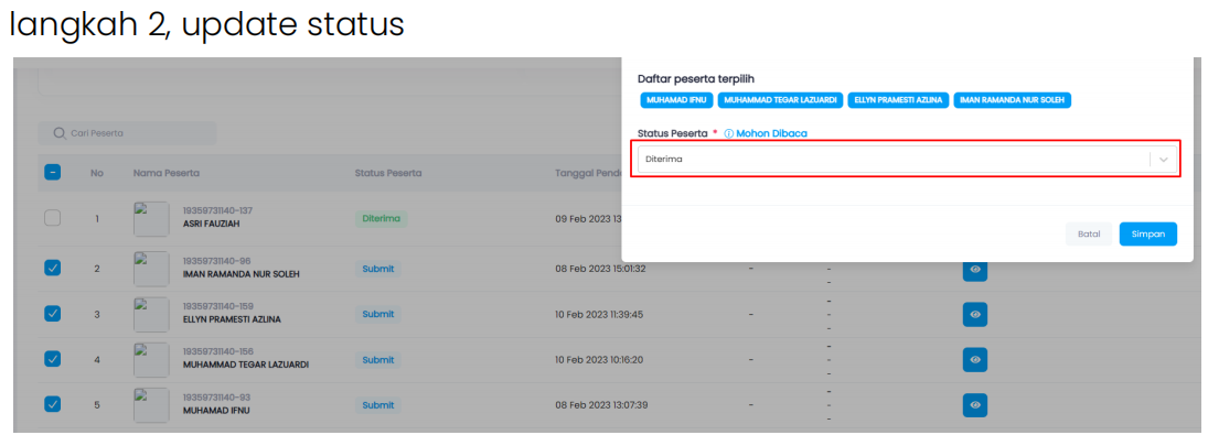 akbar akan diubah statusnya dari submit ke lulus pelatihan karena admin lupa
