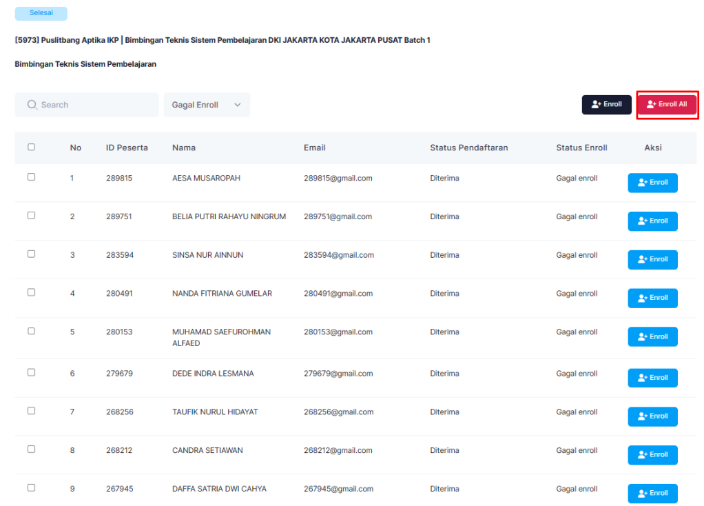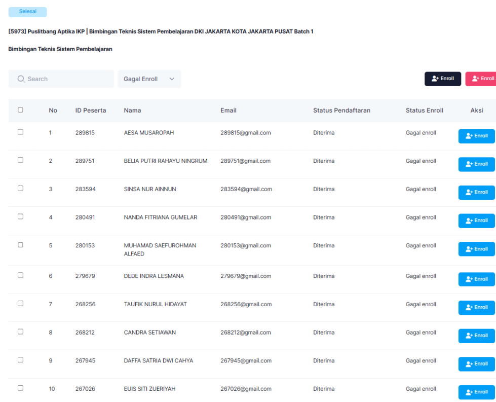 6. List Peserta yang gagal enroll akan terlihat pada list detail