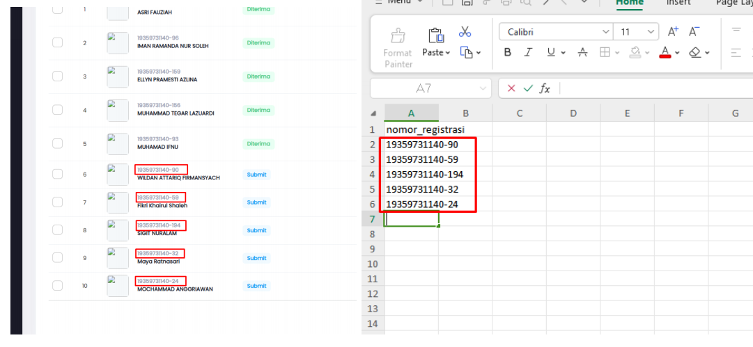 6. Masukkan no reg peserta sesuai dengan contoh pada excel, masukkan