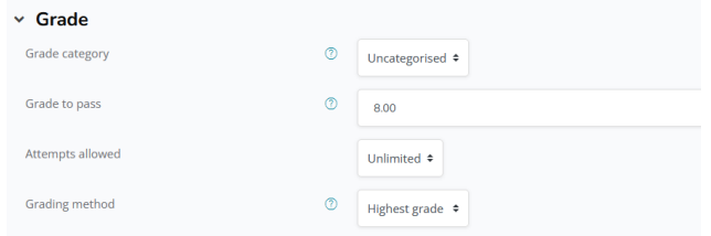 Passing grade dapat diatur pada tab grade admin dapat memberikan batas kesempatan pengerjaan :