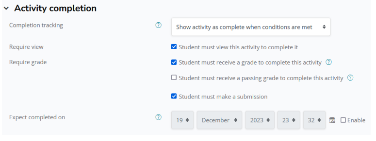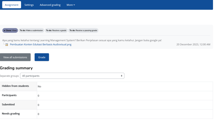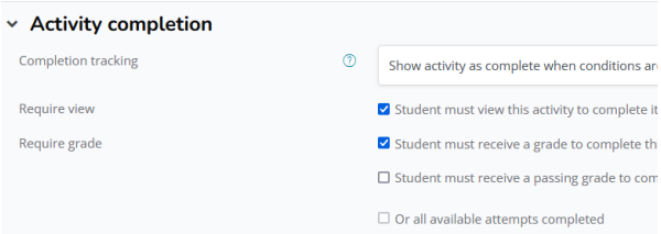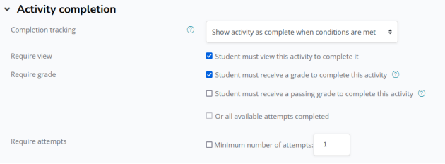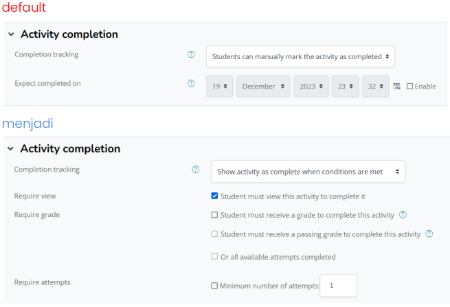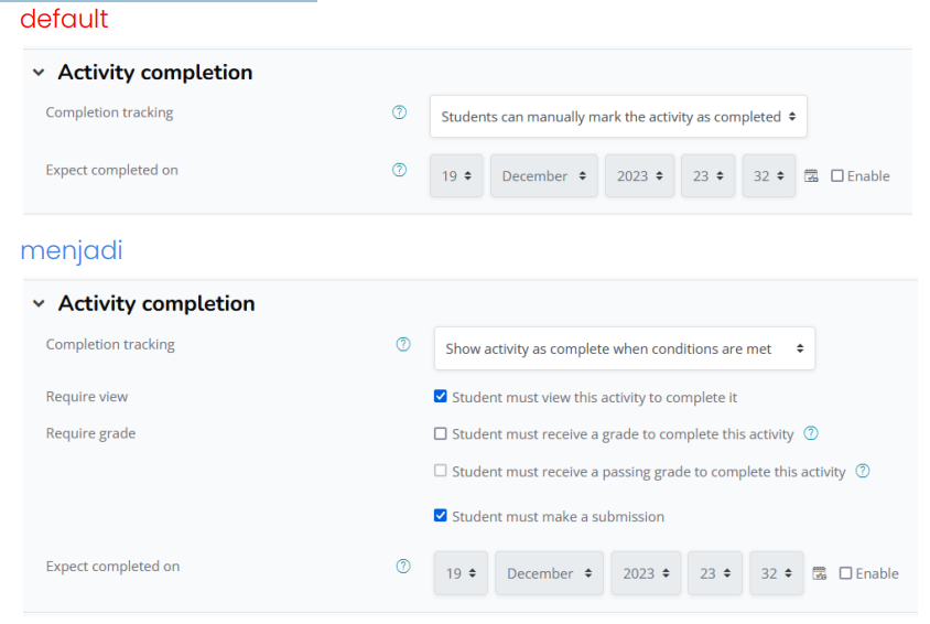 c. Jika peserta melihat activity dan mengerjakan soal dengan memberikan jawaban lalu harus diberikan nilai dulu oleh pengajar dan nilainya harus diatas passing grade baru dinyatakan memenuhi completion