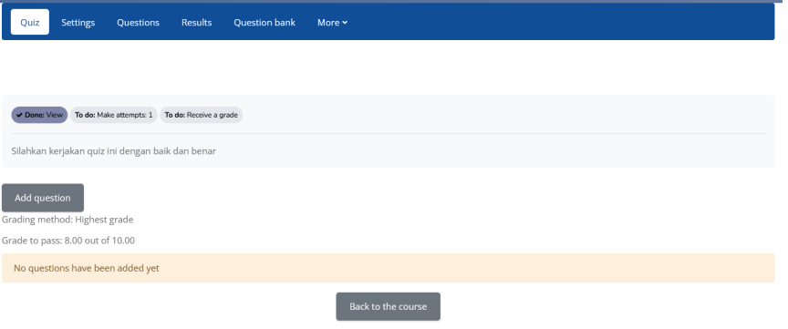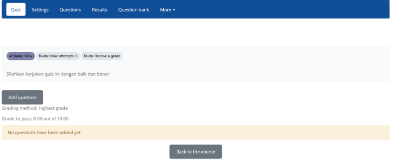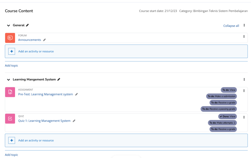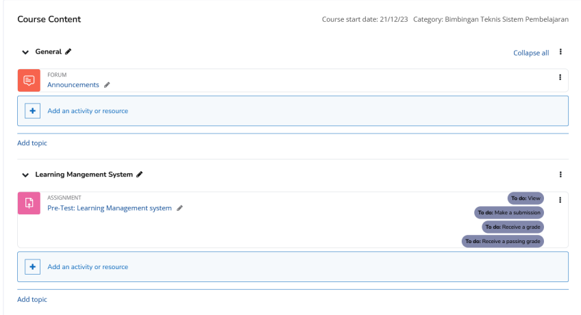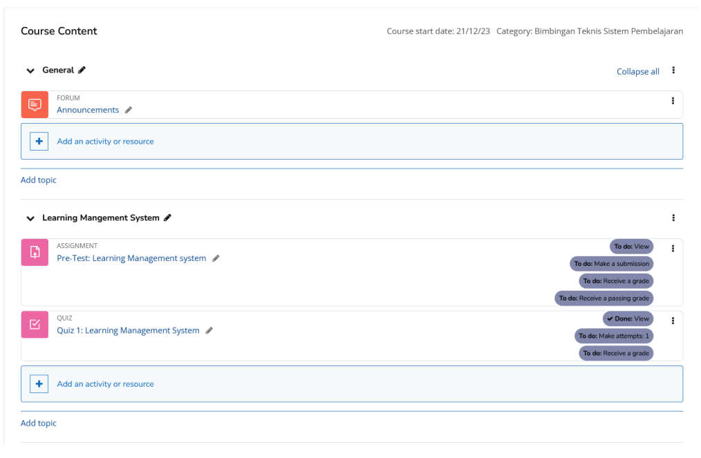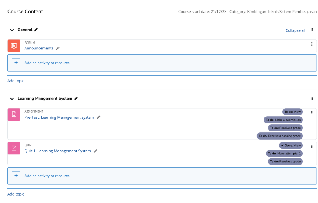 5. Halaman course akan berubah karena sudah ada akses untuk menambah suatu activity/resource