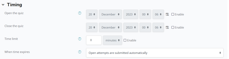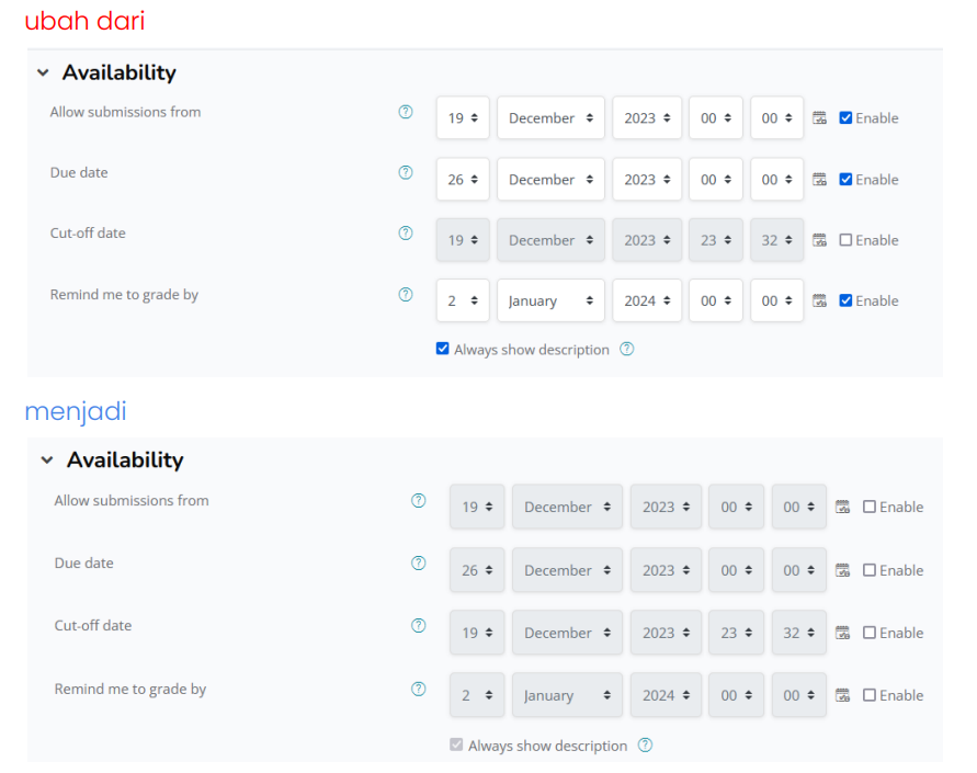 13. Sesuaikan Timing dengan mematikan seluruh date (Default sudah disable). karena nantinya setiap admin pelatihan akan melakukan restriksi akses pada masing-masing pelatihannya