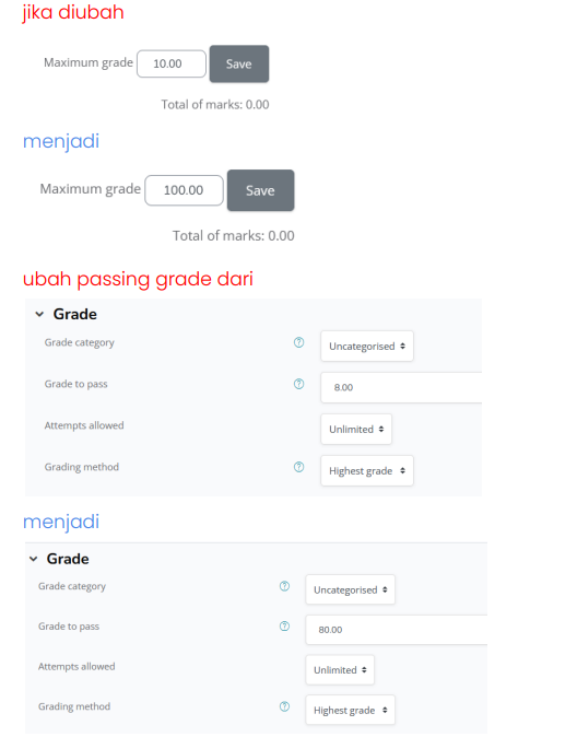 23. Admin dapat menentukan maximum grade yang akan digunakan. defaultnya adalah satuan, 10.00 atau 0-10. admin dapat merubah menjadi puluhan, 100.00 atau 0-100. Jika sebelumnya sudah menginput passing grade 8, maka diubah menjadi 80 jika satuan diubah menjadi puluhan.