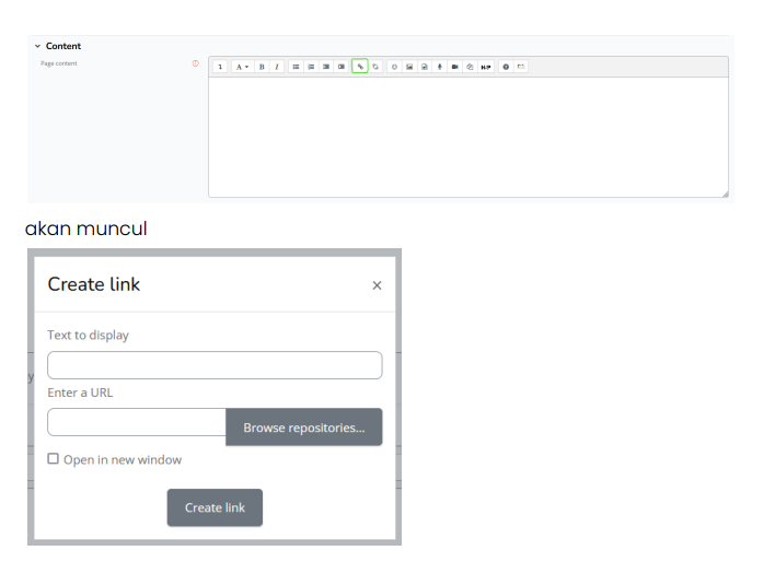 21. Kembali pada pembuatan page di LMS klik tombol link atau klik bagian dalam page content lalu klik ctrl + k