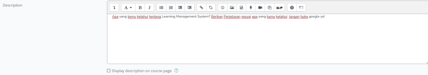 21. Pastikan kembali setting sudah benar dan tersimpan dengan baik. Jika sudah maka assignment sudah siap didaftarkan oleh admin pelatihan dan digunakan oleh peserta.