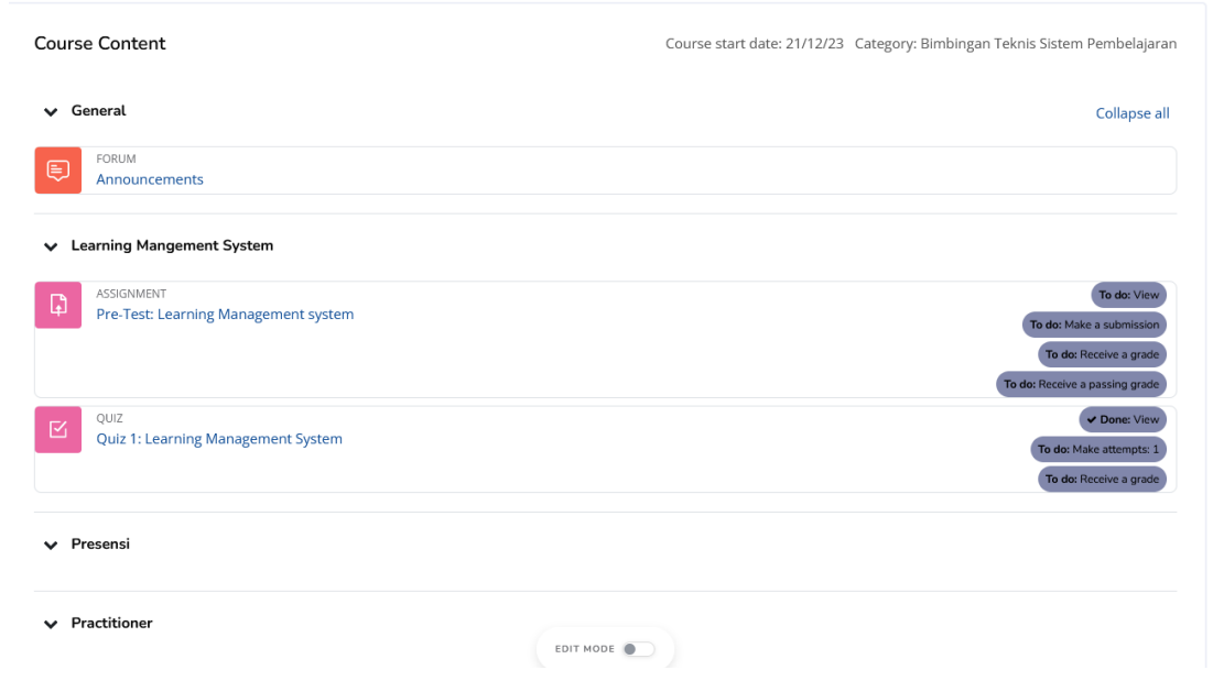 2. Akan tampil menu course seperti berikut, halaman ini akan menampilkan topik-topik sesuai dengan materi yang di input pada silabus di DTS