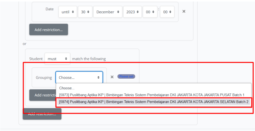f. Jika sudah memilih grup, silahkan klik add restriction lagi