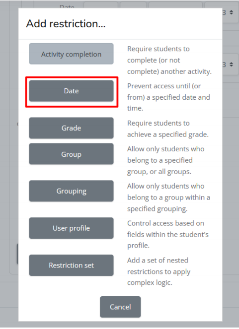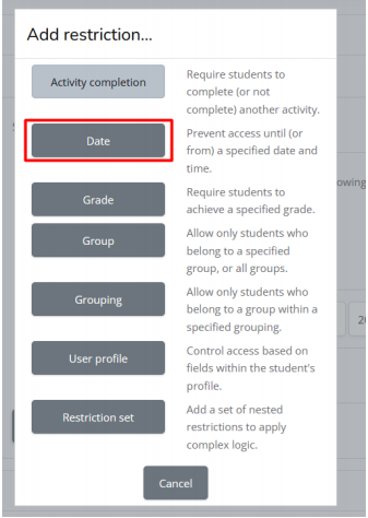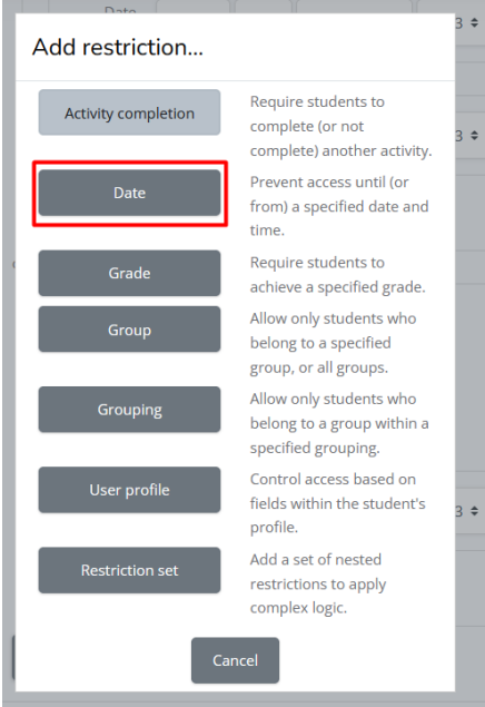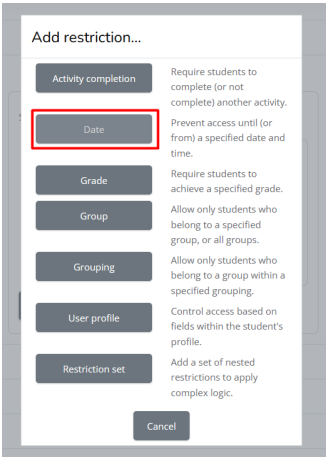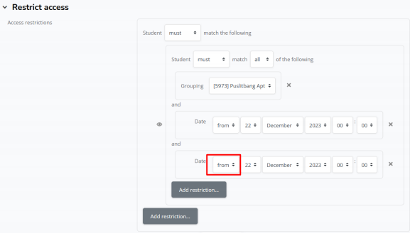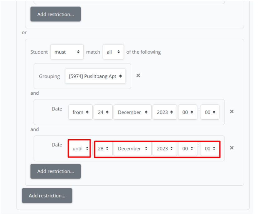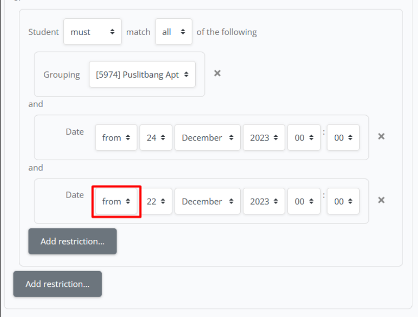 k. Jika sudah mengatur jadwal mulai, silahkan klik add restriction lagil. Klik date untuk mengatur jadwal selesai