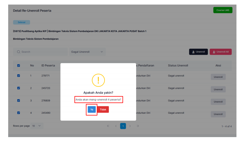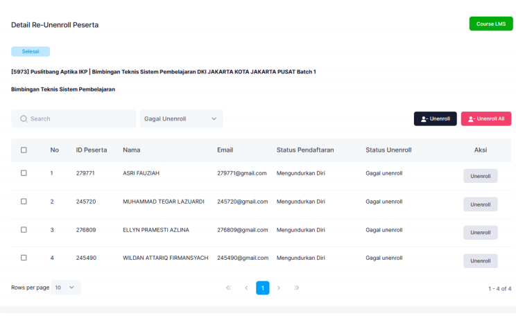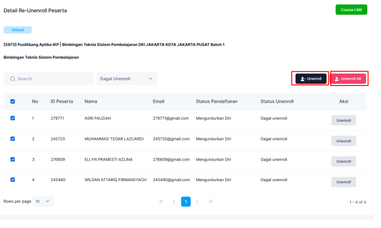 4. Perhatikan Kolom Peserta gagal unenroll, terdapat informasi bahwa 4