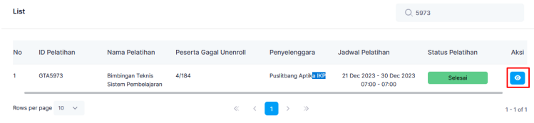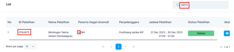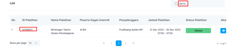 3. Cari pelatihan anda by id atau nama pelatihan pada pencarian list