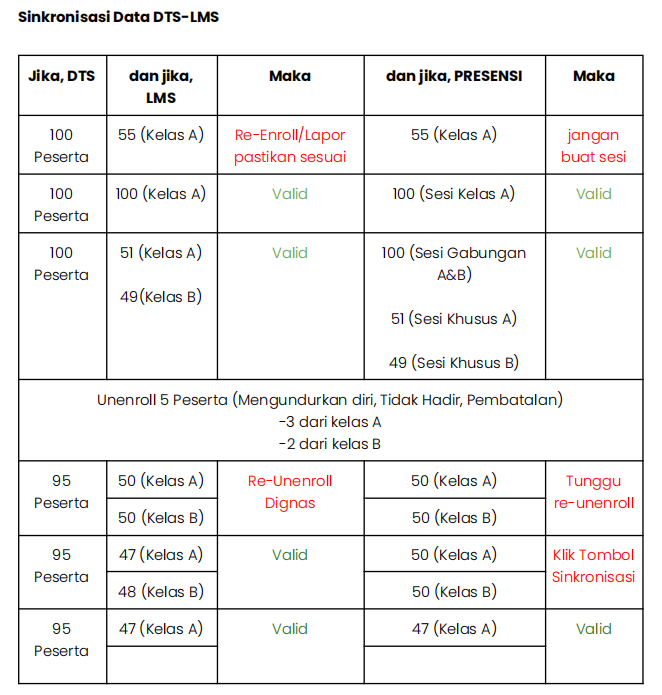 Jumlahkan Yang harus ada di LMS = Diterima + Pelatihan + Lulus + Tidak lulus + berhak sertifikasi + ikut sertifikasi Yang harus tidak ada di LMS = Tidak hadir + cadangan + mengundurkan diri + pembatalan Setelah melakukan re-enroll seharusnya DTS 20 = LMS 20